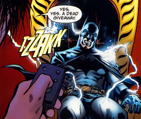 When his foe clicks a button on the remote control, intensive electric current strikes whole body of the Caped Crusader. Every muscles of the hero are convulsed with exquisite pain caused by the electric shock.